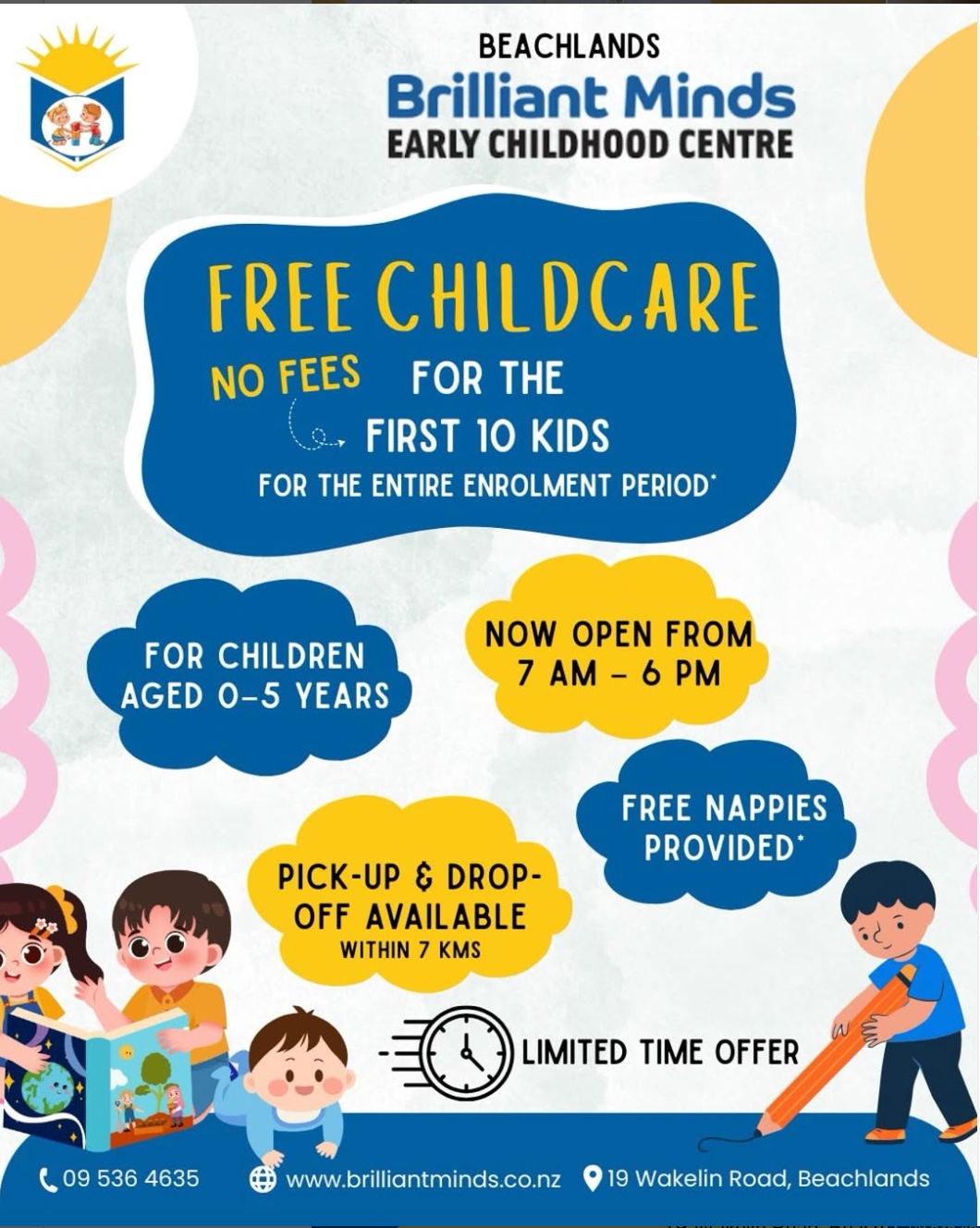 – Deal* Alert: NO FEES for the entire enrolment period. Free childcare until they turn 5! – Hurry this offer is only available for the first 10 enrolments. – FREE nappies for full-time & school-time enrolments (New Enrolments Only) – Family discounts can be applied – 10% off from eldest child fee. – WINZ subsidies and 20 hours subsidies for children 3yrs and over, may be available – Refer a Friend and Get 1 Week Free for both